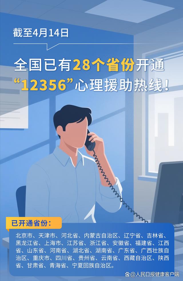据人民日报健康客户端记者不完全统计,截至4月14日,全国已有28个省市开通“12356”心理援助热线:北京市、天津市、河北省、内蒙古自治区、辽宁省、吉林省、黑龙江省、上海市、江苏省、浙江省、安徽省、福建省、江西省、山东省、河南省、湖北省、湖南省、广东省、广西壮族自治区、重庆市、四川省、贵州省、云南省、西藏自治区、陕西省、甘肃省、青海省、宁夏回族自治区。