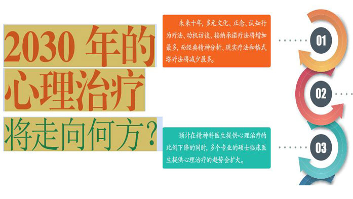 未来十年,多元文化、正念、认知行为疗法、动机访谈、接纳承诺疗法将增加最多,而经典精神分析、现实疗法和格式塔疗法将减少最多。